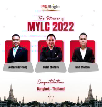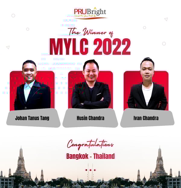Selamat kepada : - Bapak Johan Tanus Tang - Bapak Husin Chandra - Bapak Ivan Chandra yang telah menjadi perwakilan PRUBright memenangkan MYLC 2022 dengan reward perjalanan Bangkok, Thailand!